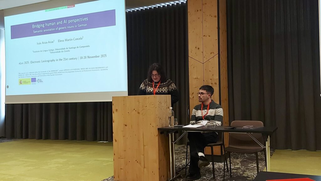 Von 18. bis 20. November 2025 waren die Projektmitglieder Ivan Arias-Arias und Elena Martín-Cancela auf der #eLex2025 und präsentierten den Beitrag: “Bridging AI and human perspectives: semantic annotation of generic nouns in German”.